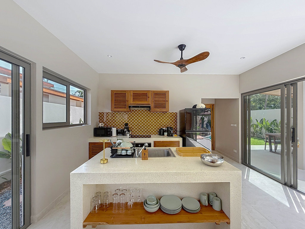 À seulement 2 km (5 minutes en voiture ou scooter) de la route principale, du supermarché TOP’S, de la plage de Maenam, des restaurants et commerces